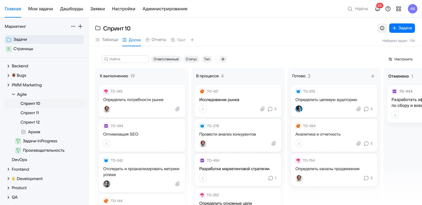 - Визуализация потока работ: все задачи отображаются на канбан-доске с колонками (например, «Запланировано», «В работе», «Тестирование», «Готово» или другими нужными для команды).