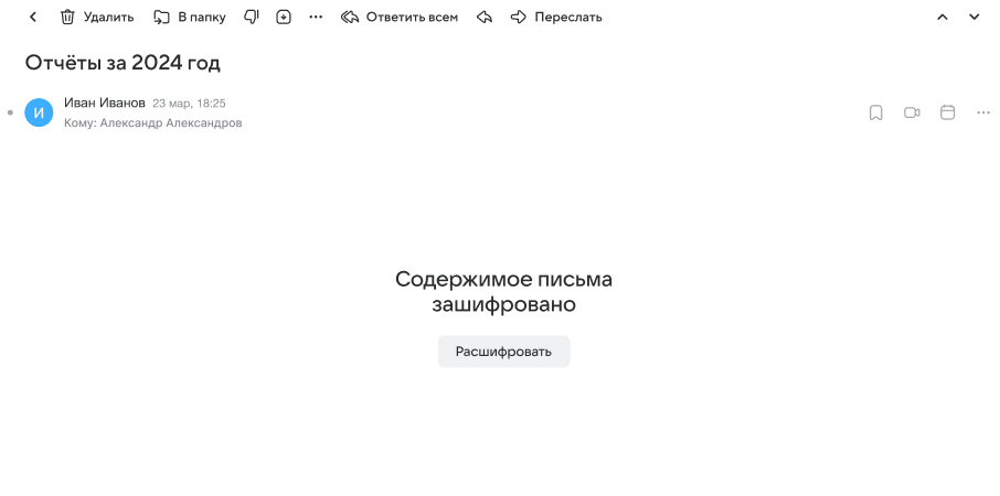 При отрытии зашифрованного письма содержимое недоступно, для расшифровки нажмите Расшифровать.