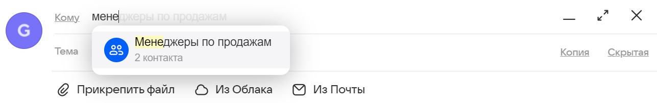Если вы создавали группу контактов в адресной книге, введите её название в полях Кому, Копия или Скрытая копия. Письмо отправится всем, кто состоит в группе.