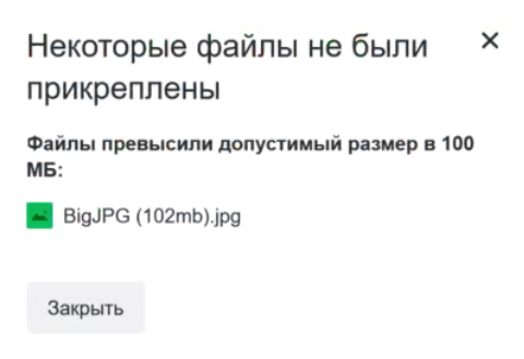 Если размер прикрепляемого к письму файла превышает установленный лимит, отобразится предупреждение об этом: