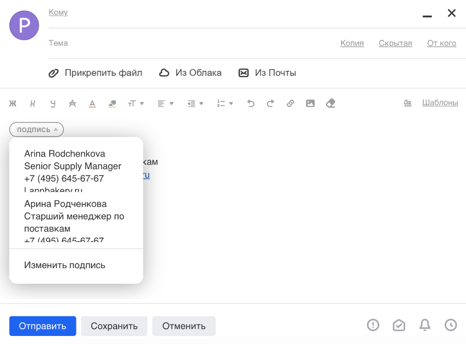 Если у вас настроено несколько подписей, вы можете выбрать нужную в тексте письма. Для этого нажмите